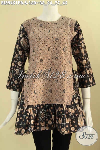 Blouse Batik Kerja Wanita Muda Masa Kini, Busana Batik Modern Model Resleting Belakang Bahan Halus Kombinasi 2 Motif Lengan 7/8 Di Lengkapi Juga Tali Di Bagian Pinggang Kanan Kiri [BLS9451PB-S]