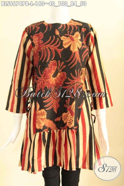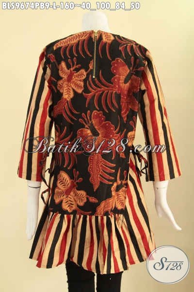 Blouse Batik Modern 2 Motif Nan Berkelas, Baju Batik Masa Kini Yang Bikin Penampilan Anggung Dan Cantik, Model Tanpa Krah Pakai Resleting Belakang Bertali Di Bagian Kanan Kiri [BLS9674PB-L]