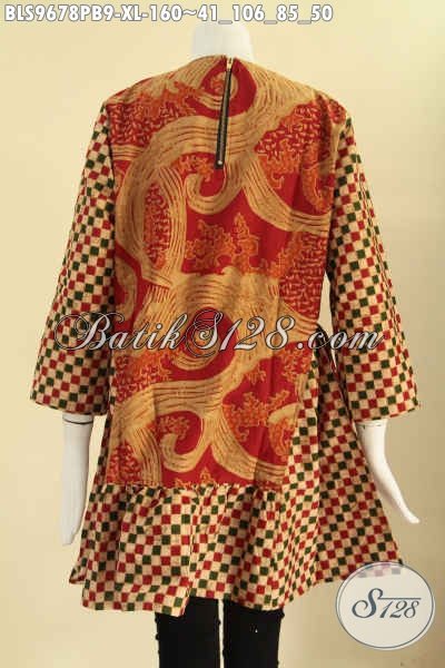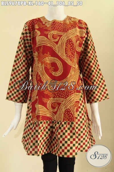 Blouse Batik Resleting Belakang Lengan 7/8, Atasan Batik Wanita 2 Motif Tanpa Krah Di Lengkapi Tali Di Bagian Pinggang Kanan Dan Kiri Untuk Penampilan Lebih Modern [BLS9678PB-XL]