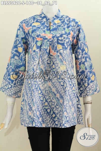 Blus Batik Biru Kwalitas Bagus Desain Trendy Kerah Shanghai Modis Buat Ke Kantor, Bahan Adem Proses Cap Harga 160K [BLS5392C-S]
