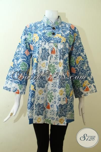 Blus Batik Biru Model Keren Motif Bagus Wanita Tampil Exist, Pakaian Batik Mewah Harga Terjangkau [BLS2546C-XL]