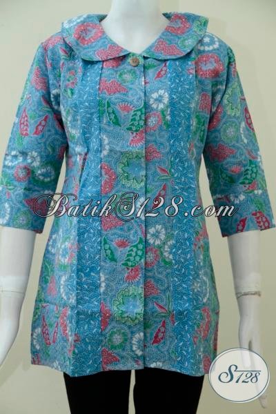 Blus Batik Biru Motif Bunga Trendy Dan Fashionable, Busana Batik Formal Wanita Kantoran [BLS1598PD-M]