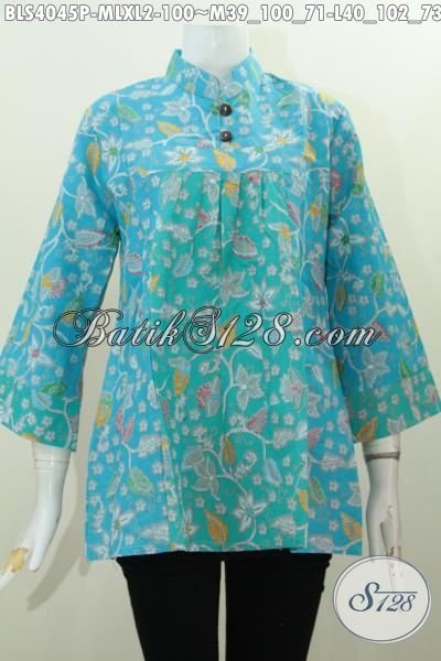 Blus Batik Biru Muda Motif Trendy Paling Keren Saat Ini, Baju Batik Wanita Masa Kini Model Kerah shanghai Mekar Tampil Gaya Dan Feminim [BLS4045P-M , L , XL]
