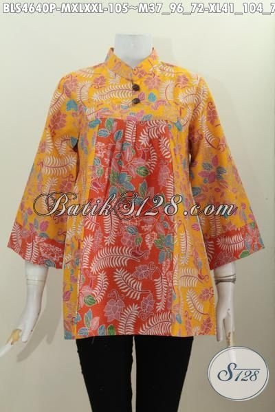 Blus Batik Fashion Warna Kuning Kombinasi Orange, Busana Batik Istimewa Harga Murmer Desain Bagus Kerah shanghai Pakai Kancing Modis Untuk Jalan-Jalan [BLS4640P-M , XL , XXL]