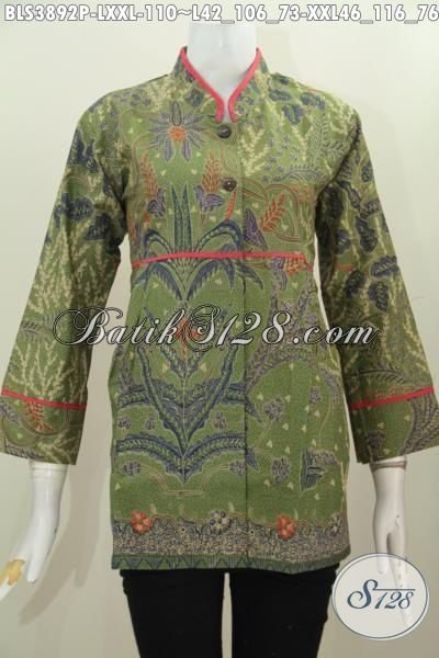 Blus Batik Hijau Elegan Model Kerah Shanghai Plisir Polos, Baju Batik Printing Berkelas Desain Istimewa Bisa Untuk Santai Dan Resmi [BLS3892P-L , XXL]