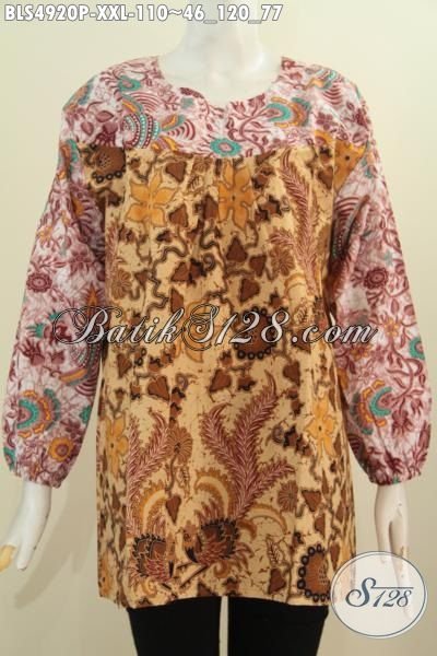 Blus Batik Jumbo Buatan Solo Untuk Wanita Gemuk, Pakaian Batik 3L Lengan Panjang Dual Warna Bahan Halus Motif Printing Hanya 100 Ribuan [BLS4920P-XXL]