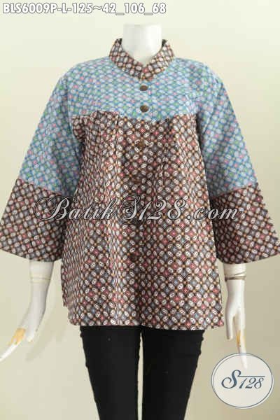 Blus Batik Keren Buatan Solo, Baju Batik Kerah Shanghai Nagit Untuk Seragam Kerja, Pakaian Batik Masa Kini Motif Bagus Warna Keren Proses Printing Hanya 100 Ribuan [BLS6009P-L]