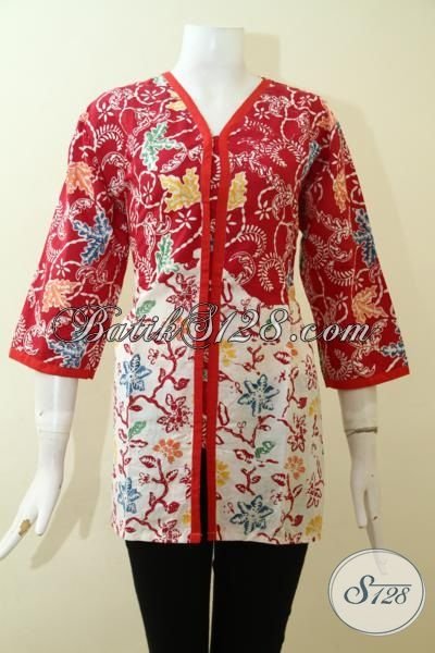 Blus Batik Keren Warna Merah Kombinasi Putih, Blus Batik Cap Motif Klasik Modern Kwalitas Premium Harga Terjangkau [BLS2623C-L]