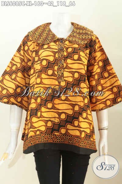 Blus Batik Klasik Wanita Dewasa, Pakaian Batik Berkelas Bahan Adem Proses Cap Untuk Penampilan Makin Elegan Berkelas Model Kerah Bulat [BLS6085C-XL]
