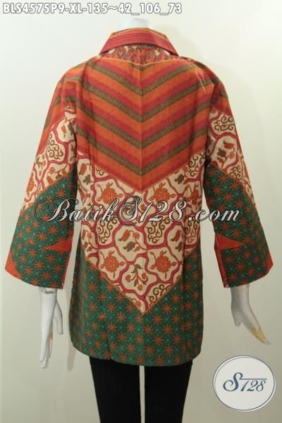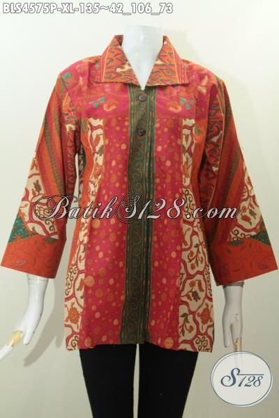 Blus Batik Klasik Warna Merah, Pakaian Batik Modis Dan Keren Desain Elegan Kerah Kotak Proses Printing Dengan Motif Sinaran Sempurnakan Penampilan Wanita Karir [BLS4575P-XL]