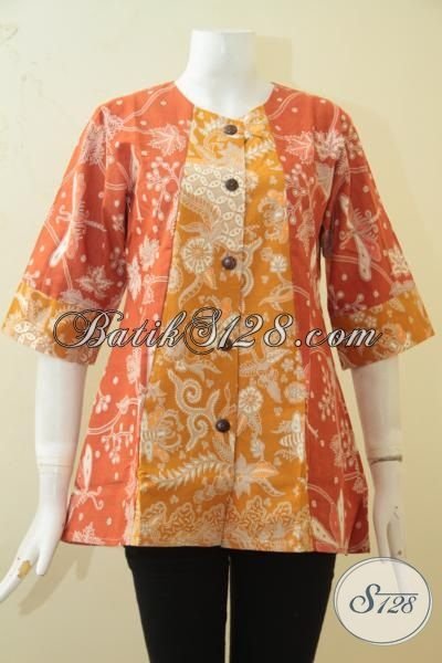 Blus Batik Kombinasi Dua Motif, Batik Kerja Warna Orange Berpadu Kuning, Batik Kombinasi Tulis Kwalitas Halus Desain Mewah Harga Murmer [BLS3365BT-M]
