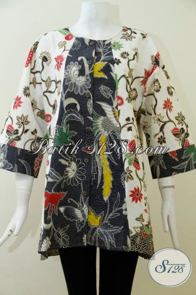 Blus Batik kombinasi Warna Putih Dan Hitam, Pakaian Batik Solo Motif Klasik Modern Untuk Wanita Gemuk Tampil Cantik Nan Elegan [BLS1971BT-XXL]