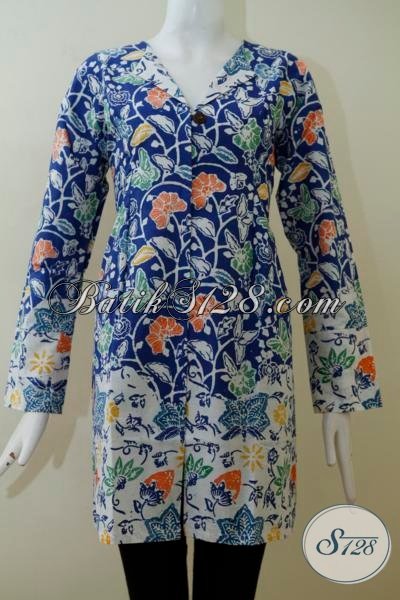 Blus Batik Lengan panjang Motif Keren Berpadu Warna Dasar Biru Dan Putih, Baju Batik Trendy Membuat Wanita Tampil Cantik Dan Anggun [BLS2038C-M]
