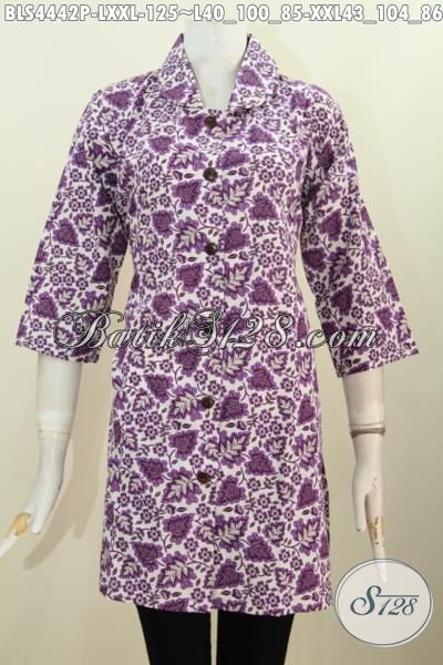 Blus Batik Modern Buat Wanita Dewasa Yang InginTerlihat Mempesona, Baju Batik Model Kerah Bulat Warna Ungu Motif Bagus Proses Printing Harga Hanya 125K [BLS4442P-XXL]