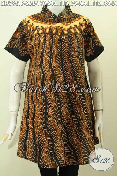 Blus Batik Motif Bulu Merak, Baju Batik Kerah Shanghai Elegan Proses Printing Model Lengan Pendek, Pas Untuk Kerja Dan Jalan-Jalan [BLS7841P-M]