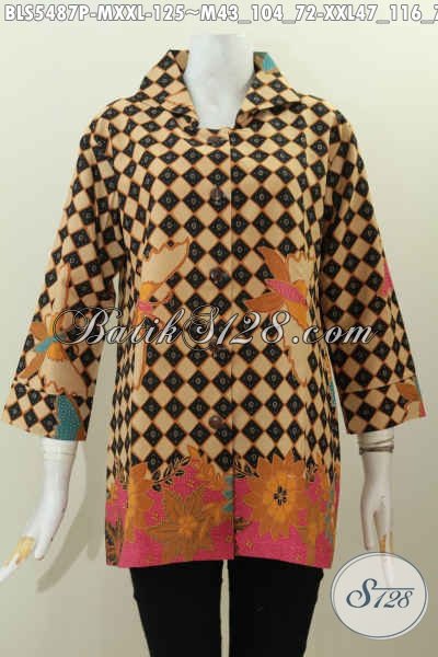 Blus Batik Motif Terbaru Model Kerah Kotak, Baju Batik Atasan Proses Printing Buatan Solo Warna Elegan Bisa Untuk Santia Dan Resmi [BLS5487P-M , XXL]