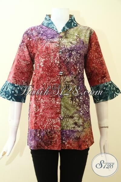 Blus Batik Motif Unik Dengan Kombinasi Warna Merah Hijau Dan Ungu Proses Cap Smoke, Pakaian Batik Modern Bisa Untuk Kerja Dan Santai [BLS2649CS-M]