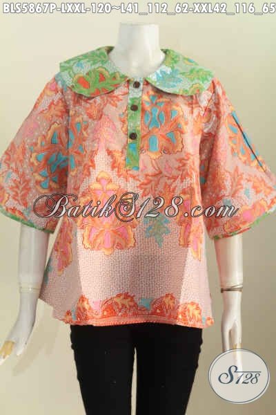 Blus Batik Orange Kerah Bulat, Pakaian Batik Trendy Bahan Adem Proses Printing Untuk Penampilan Lebih Gaya [BLS5867P-L , XXL]