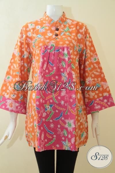 Blus Batik Orange Kombinasi Merah Muda, Batik Pesta Desain Terkini, Busana Batik Printing Di Jual Online [BLS3083P-XL]