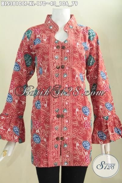 Blus Batik Trendy Buatan Solo Model Kerah Shanghai Berbahan Halus Proses Cap Tulis, Baju Batik Model Terkini Bikin Wanita Terlihat Luar Biasa [BLS3810CT-XL]