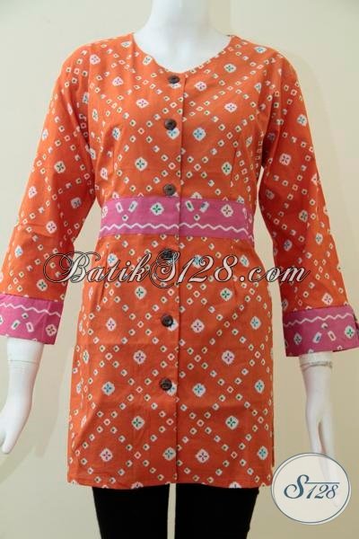 Blus Batik Trendy Warna Orange Cerah, Pakaian Batik Cantik Wanita Muda Aktif, Bisa Untuk Resmi Maupun Santai [BLS1537P-S,M,L,XL]