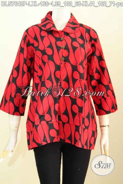 Blus Batik Wanita Dewasa Motif Parang, Busana Batik Printing Kerah Bulat Kancing Depan Warna Monokrom Merah Hitam Nan Elegan [BLS7648P-L]