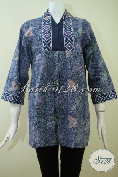 Blus Batik Wanita Masa Kini Warna Biru, Pakaian Batik Kerja Trendy Motif Keren Trend Masa Kini [BLS2383CT-M]