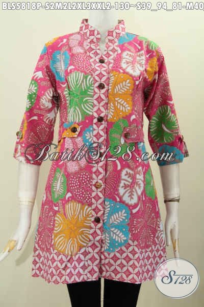 Blus Batik Warna Pink, Pakaian Batik Keren Model Decker Bahan Adem Motif Trendy Proses Printing Untuk Wanita Muda Dan Dewasa Tampil Anggun Mempesona [BLS5818P-S , M , XL , XXL]