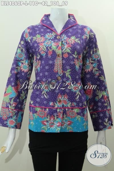 Blus Batik Warna Ungu Dengan Motif Bunga Yang Trendy Kesukaan Wanita Karir, Baju Santai Bahan Batik Printing Halus Desain Modern Tampil Lebih Cantik Maksimal [BLS4060P-L]