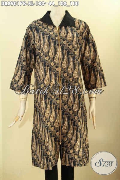 Busana Batik Dress Elegan Motif Klasik Kombinasi Kerah Polos, Baju Batik Istimewa Lengan 3/4 Bahan Halus, Cocok Untuk Acara Resmi Tampil Menawan [DR8901PB-XL]