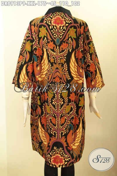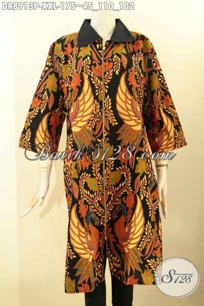 Busana Batik Dress Solo Jawa Tengah Terbaru, Dress Batik Istimewa Lengan 3/4 Bahan Adem Motif Mewah, Baju Batik Kekinian Resleting Depan Wanita Gemuk Tampil Trendy Dan Stylish [DR8913P-XXL]