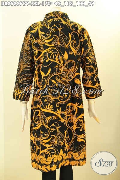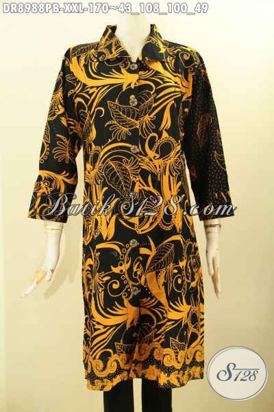 Busana Batik Dress Solo Lengan 7/8, Baju Batik Dress Jumbo Nan Istimewa Model Kerah Dengan Kancing Depan Berpadu Motif Modern Nan Istimewa Proses Printing Cabut, Bikin Penampilan Anggun Dan Cantik [DR8988PB-XXL]