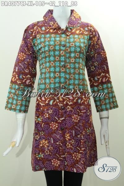 Busana Batik Dress Wanita Dewasa Karir Aktif, Produk Pakaian Batik Terbaru Model Kerah Bulat Kwalitas Istimewa Proses Cap Tulis Asli Solo [DR4077CT-XL]