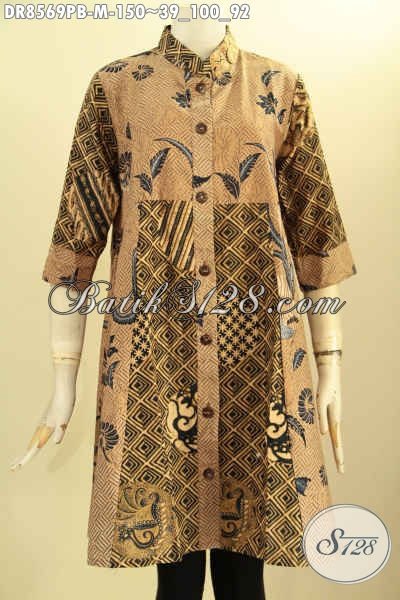 Busana Batik Elegan Dan Berkelas Yang Membuat Wanita Terlihat Anggun Mempesona, Tunik Batik Dress Lengan 7/8 Dengan Krah Shanghai Dan Kancing Depan Motif Terbaru Proses Printing Cabut Harga 150K [DR8569PB-M]