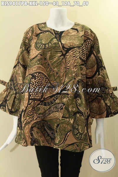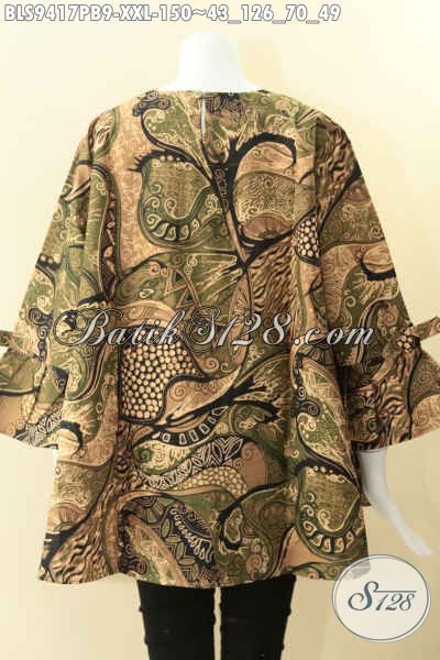 Busana Batik Kerja Big Size Spesial Untuk Wanita Gemuk, Blouse Batik Model Kancing Belakang Lengan 7/8 Di Lengkapi Pita, Tampil Trendy Dan Kekinian [BLS9417PB-XXL]