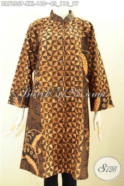 Busana Batik Kerja Wanita Gemuk, Baju Batik Terusan Wanita Big Size, Bahan Halus Dengan 2 Motif Model Krah Shanghai Kwalitas Istimewa [DR7885P-XXL]