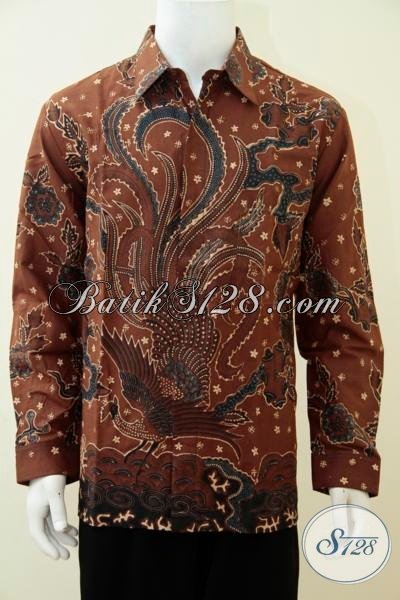 Busana Batik Klasik Warna Coklat Motif Burung Merak, Kemeja Batik Kombinasi Tulis Lengan Panjang Membuat Penampilan Pria Semakin Elegan Berwibawa [LP2890BT-XL]