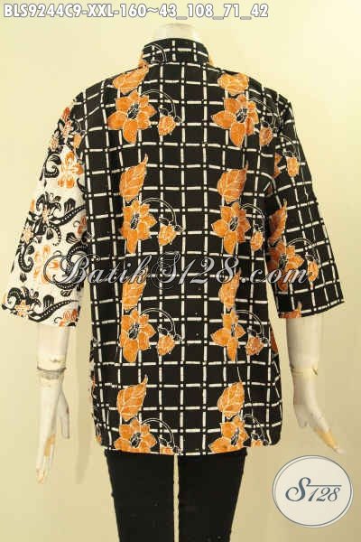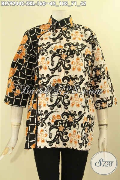 Busana Batik Lengan 3/4 Modis Exclusive Wanita Gemuk, Pakaian Batik Blouse Kerah Shanghai Kombinasi Plesir Polos Kancing Depan, Pas Buat Acara Resmi Dan Seragam Kerja [BLS9244C-XXL]