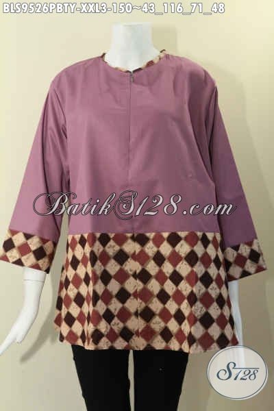 Busana Batik Solo Masa Kini Untuk Wanita Gemuk, Hadir Dengan Kombinasi Kain Polos Katun Toyobo Kwalitas Istimewa Model Tanpa Krah Resleting Depan Dengan Lengan 7/8 [BLS9526PBTY-XXL]