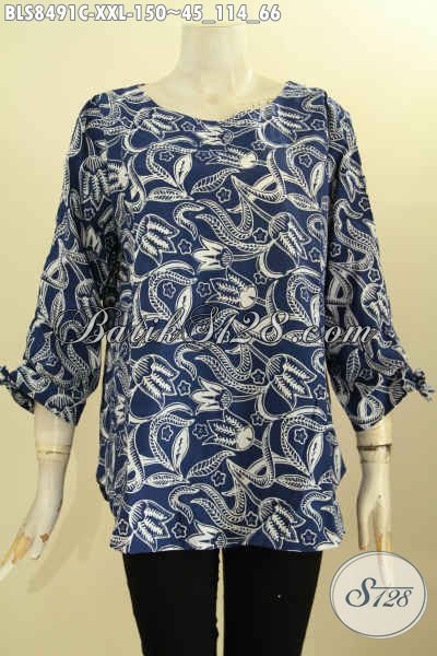 Busana Batik Trendy Dengan Tali Di Ujung Lengan, Blouse Batik Solo Kekinian Di Lengkapi Kancing Belakang Berbahan Halus Warna Biru Motif Terbaru Proses Cap, Spesial Untuk Wanita Gemuk Untuk Tampil Gaya [BLS8491C-XXL]