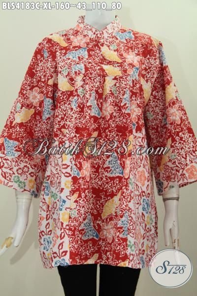 Busana Batik Trendy Wanita Dewasa Bahan Halus Motif Trendy, Pakaian Batik Proses Cap Warna Merah Kerah Shanghai Tampil Lebih Menawan [BLS4183C-XL]