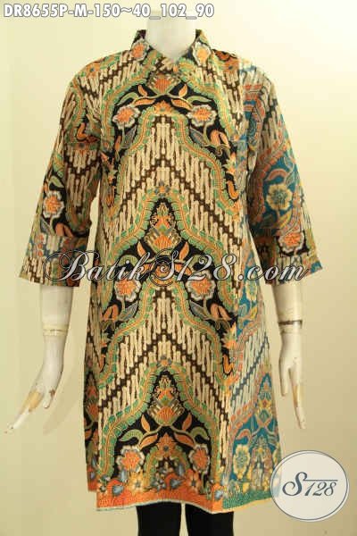 Busana Batik Wanita Muda Yang Bikin Penampilan Elegan Berkelas, Tunik Batik Dress Solo Kekinian Dengan Kerah Shanghai Lengan 7/8 Pakai Saku Dalem Serta Resleting Belakang [DR8655P-M]