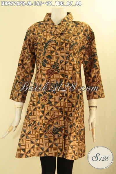 Busana Batik Wanita Nan Elegan Model Kerah Miring Motif Bagus Jenis Printing Cabut, Dress Batik Solo Istimewa Kancing Depan Lengan 7/8, Tampil Cantik Dan Gaya [DR9276PB-M]
