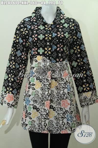 Busana Blus Batik Model Terbaru Kerah Bulat, Baju Batik Dua Motif Dan Warna Proses Cap Ukuran Jumbo Spesial Buat Kerja Cewek Gemuk [BLS4161C-XXL]