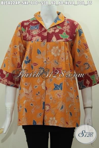 Busana Blus Kuning Kombinasi Merah, Baju Batik Lengan Tiga Perempat Kwalitas Halus Model Kerah Langsung Bahan Adem Motif Proses Printing, Tampil Lebih Gaya [BLS4224P-S , XL]