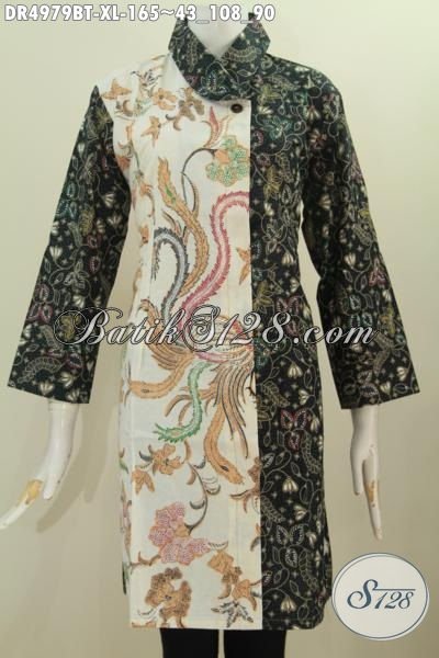 Busana Dress Batik Dua Motif Warna Pagi Sore, Pakaian Batik Kerah Miring Bahan Halus Buatan Solo Harga 165K Buat Wanita Dewasa Karir Aktif [DR4979BT-XL]