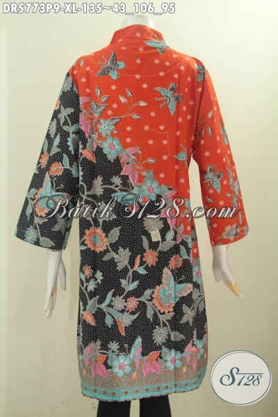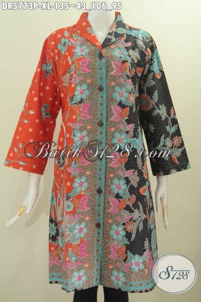 Busana Dress Batik Kekinian, Pakaian Batik Kerah Langsung Motif Pagi Sore Bahan Halus Proses Printing Tampil Cantik Dan Trendy [DR5773P-XL]