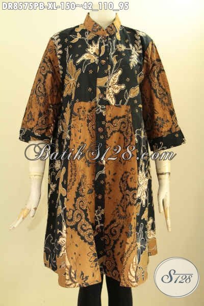 Busana Tunik Batik Dress Krah Shanghai, Pakaian Batik Halus Motif Trendy Dengan Warna Klasik Di Lengkapi Kancing Depan Proses Printing Cabut, Bisa Untuk Acara Santai Dan Resmi [DR8575PB-XL]