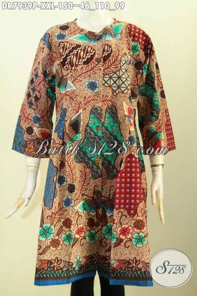 Dress Batik Big Size, Baju Batik Trusan Spesial Untuk Wanita Gemuk, Pakaian Batik Istimewa Tanpa Krah Big Size Kancing Depan 100 Ribuan [DR7939P-XXL]
