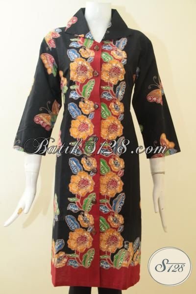Dress Batik Dasar Hitam Kombinasi Warna Merah Motif Bunga Kuning, Baju Batik Seragam Kerja Wanita Tampil Elegan Dan Modis [DR2691CT-XXL]